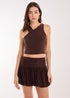 Style the colour of the season into your wardrobe with this top. Featuring a chocolate brown stretchy material, a one shoulder, a double layer and a cropped length. Pair it with our Slinky Puffball Mini Skirt.