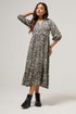 In need of a day & night dress option? Look to this animal print style. Made from a soft jersey fabric, it features 3/4 length sleeves, an open collar and completes with a tiered style skirt that falls at a maxi length. Pair with boots and layer over a biker jacket to complete the look!
