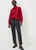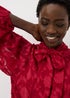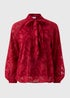 Perfect for day-to-night dressing, this chic red jacquard blouse makes a bold statement. The delicate floral mesh overlay adds depth and movement, while the sheer sleeves introduce a light, elegant contrast. A soft tie-neck detail completes the look, offering a refined finish that can be styled loose or in a neat bow. With its relaxed silhouette and gently gathered cuffs, this piece strikes the perfect balance between sophistication and ease.