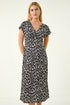Abstract Spot Print Back Detail Dress from Roman. Start the season in style with this fabulous abstract spot dress. Perfect for Spring Summer, this dress features a trendy v-neckline, short sleeves, and a flattering empire waist. Cut from a comfortable fabric with a unique abstract spot print, this midi length dress is a must-have for your wardrobe. Pair with a denim jacket and wedged heels for a chic look!
