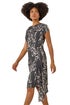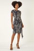 Abstract Wrap Tie Dress from Roman. Wrap up your Autumn/Winter wardrobe with this stunning wrap tie detail dress. Designed with a flattering round neck and finishing above the knee, this dress is perfect for any occasion. Featuring elegant flutter sleeves and a unique side by side fabric design, this dress exudes sophistication. Pair with strappy heels and a chic blazer for a stylish ensemble that will turn heads wherever you go.