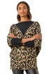 Animal Print Knit Jumper from Roman. Wrap yourself up in style with this wild animal print knit jumper. Stay cosy this Autumn Winter season with the warm round neckline and long sleeves. Cut from a comfortable knit fabric, this jumper features a striking animal print with a trendy colour block design, adding a touch of fierceness to your wardrobe. Pair it with wide leg trousers and ankle boots for an effortless outfit that will keep you stylish all day long!