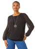 Chiffon Banded Hem Pleated Top from Roman. Elevate your Autumn/Winter wardrobe with this chic pleated top. Featuring a classic round neck and intricate pleated detailing at the front neck, this top is a true standout piece. The long sleeves with elasticated cuffs, banded hem, and contrasting fabric composition of jersey inner and chiffon woven outer create a perfect blend of comfort and style. With delicate chiffon sleeves adding an elegant touch, pair with jeans and ankle boots for casual sophistication.
