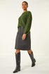 Coated Stretch A-Line Skirt from Roman. Make a sleek fashion statement this Autumn and Winter with this coated A-line skirt. Cut in a flattering A-line shape with added stretch for comfort, this skirt features practical angled front pockets and a front zip fastening with stud button for a stylish touch. Completed with functional belt loops, this skirt is perfect for pairing with knitwear and boots for a chic and effortless seasonal look!