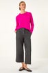 Coated Wide Leg Cropped Trouser from Roman. Get ready to rock a fashion-forward look in these coated wide crop trousers. Crafted from a pleather-effect fabric with a hint of stretch for added comfort, these statement trousers feature a wide leg silhouette, side angled pockets, and an elasticated waistband with a sleek zip and hook fastening. Pair with a simple knit for chilly Autumn days or a plain tee for a cool and Summery statement style!