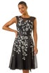 Embroidered Tie Waist Midi Dress from Roman. Embrace the enchanting beauty of the season with this stunning silver and black embroidered dress. With delicate floral embroidery, a flattering tie waist and elegant mesh detail, this midi length dress is perfect for special occasions. The short sleeves add a touch of sophistication to this exquisite piece. Complete your look with sleek strappy heels and a chic blazer for a perfectly polished ensemble.