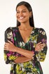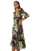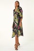 Floral Print Chiffon Midi Dress from Roman. Add a touch of feminine charm to your Autumn Winter wardrobe with this lovely floral print midi dress. Featuring a wrap over v-neckline and elegant 3/4 length sleeves, this dress is crafted from a comfortable chiffon fabric that ensures a stylish fit. The hanky hem and shirred waist is flattering for any occasion. Complete your look with a warm bolero jacket and heeled boots!