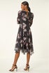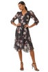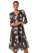 Floral Print Hanky Hem Dress from Roman. This elegant floral print chiffon dress brings effortless charm to your wardrobe. Designed with a flattering wrap-over V-neckline and a soft shirred waist for added definition, it features a fluid hanky hem and a midi length silhouette. The 3/4 sleeves offer light coverage, while the full body lining ensures comfort. Style with tights and heels for a chic look perfect for both daytime events and evening outings.