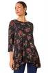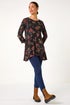Floral Print Lace Trim Stretch Top from Roman. Embrace timeless style with our captivating lace trim top, perfect for Autumn Winter. Featuring a classic round neck and 3/4 sleeves, this flattering tunic shape top is designed in a stretchy jersey fabric that finishes at the hips. The all-over floral print is linked with elegant lace insert details for a touch of femininity. Effortlessly wear this top with a fluid hem, exuding class and comfort. Style this dots for days top this Fall with denim jeggings and boots for a casual evening occasion.