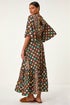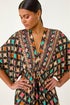 Geo Print V-Neck Frill Maxi Dress from Roman. Make a statement with our beautiful geo print v-neck maxi dress this Spring Summer season. Embrace the deep v-neckline and batwing style sleeves, all crafted from a comfortable woven fabric adorned with a striking geo print. The dress falls gracefully at maxi length with a flattering gathered waist and delicate frill hem, creating a flowy and elegant silhouette. Complete your look by pairing it with a denim jacket and wedge heels!