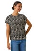 Geometric Ikat Print Bubble Hem Top from Roman. Update your Spring/Summer wardrobe with this stylish bubble hem top featuring an all over ikat geometric print. The short sleeves and round neckline offer a comfortable fit, while the textured stretch jersey fabric ensures a flattering silhouette. The elasticated bubble hem adds a touch of fun to the top, making it a versatile piece for any casual occasion. Pair with jeans and sandals for an effortlessly chic look this season!