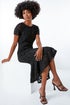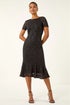 Leaf Lace Sequin Midi Dress from Roman. Crafted from a beautiful lace fabric with sequin detailing, this dress is fitted at the bust and flares out elegantly sculpting your silhouette, finished with a flared hem with godet paneling for extra swing in your step. In a beautiful shade, this dress is perfect for the upcoming party season. Wear yours with sparkly heels and clutch bag for a statement party look.