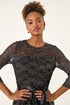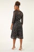 Metallic Lace Frill Sleeve Dress from Roman. Add a touch of elegance to your wardrobe with our stunning knee-length dress adorned with intricate lace detail. Designed with a classy round neckline and short sleeves, this dress features silver metallic details for a touch of glamour. Cut from a comfortable woven fabric, ensuring a flattering fit with a bow front finish. Complete the look with strapped heels and a trendy bolero!