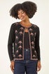 Metallic Print Knit Cardigan from Roman. Add a touch of glamour to your Autumn Winter wardrobe with this stunning metallic cardigan. Featuring an elegant edge to edge opening secured by hook and eye fastenings, this cardigan instantly elevates any outfit. The metallic print adds a subtle sparkle to your look, making it perfect for the festive season. Pair with wide-leg jeans and ankle boots!
