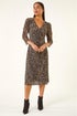 Petite Animal Print Lace Stretch Dress from Roman. Elevate your wardrobe with this stunning Petite animal lace dress, perfect for the Autumn Winter season. Crafted from a luxurious stretch lace fabric, this dress features an elegant v-neck and feminine 3/4 sleeves. The flattering fit includes a ruched front detail, while the lining ensures comfort all day long. Simply pull on this stylish dress and pair it with strappy heels and a trendy bolero for a polished look!
