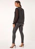 Learn moreRuffle Front Keyhole Satin Top from Roman. Add a touch of elegance to your Autumn Winter wardrobe with our stunning satin top. Featuring a classic round neck and long mesh sleeves with delicate elasticated cuffs, this top is both trendy and feminine. The keyhole detail at the front neck and button closure at the back add subtle sophistication, while the ruffle accents at the neck and centre front bring a touch of drama. Pair with jeans and heeled boots for a stylish ensemble that transitions from day to night!