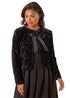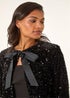 Sequin Bow Front Jacket from Roman. Shine bright like a diamond in this stunning sequin jacket, just in time for the Autumn/Winter season. Adorned with a chic bow tie detail at the neck, this jacket features elegant long sleeves for a sophisticated touch. Perfect for adding a touch of glamour to any outfit, style this sequin jacket with a sleek cami top, your favourite jeans, and a pair of statement heels for a show-stopping look!