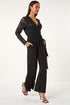 Sequin Lace V-Neck Stretch Jumpsuit from Roman. Get ready to sparkle and shine in our stunning sequin lace jumpsuit. The feminine v-neckline with a wrap-over front and long sleeves makes it perfect for the cooler months. Crafted from a stretch lace fabric adorned with dazzling sequins, this jumpsuit is sure to turn heads. The full-length trousers feature a self tie belt for comfort and angled side pockets for your essentials. Style with heels and a bolero for a special occasion to make a glamorous entrance!