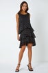 Shimmer Foil Print Tiered Dress from Roman. Shimmer and shine in a fabulous frill number! Perfect for the festive party season, this metallic print tiered dress is sure to become a favourite. Cut from a flowing chiffon fabric that features a metallic fibre print, this luxurious dress is designed with a classic round neckline and a captivating, tiered silhouette. A soft inner lining keeps you covered whilst a sleeveless silhouette adds a playful twist, ideal for layering. Wear with a metallic heel, bolero and clutch bag for a sensational evening occasion outfit.