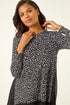 Spot Print Chiffon Hem Stretch Top from Roman. Add a touch of charm to your Autumn Winter wardrobe with this stylish spot print tunic. Designed in a comfortable jersey stretch fabric, this tunic features a pretty chiffon hem detail. The round neckline and long sleeves make it warm to wear, while the spot print gives it a playful vibe. Pair with wide-leg jeans and ankle boots for a complete look that's perfect for any casual outing!
