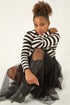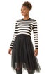 Stripe Print Mesh Midi Dress from Roman. Get ready to step out in style this Autumn Winter in this trendy stripe print midi dress. Cut from a soft knitted fabric, this dress features a cosy round neckline and long sleeves to keep you warm on chilly days. The flattering midi length and mesh skirt detail add a touch of elegance to the look. Pair with a denim jacket and ankle boots for a stunning fall outfit that will turn heads wherever you go!