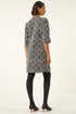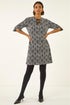 Tile Print Tie Keyhole Stretch Dress from Roman. Elevate your Autumn Winter wardrobe with this chic tile keyhole dress. Designed with a trendy tie neckline and keyhole detail, this knee-length dress is crafted from a comfortable stretch woven fabric featuring a striking jacquard tile print. The shift shape with 3/4 sleeves is both stylish and versatile, making it perfect for any occasion. Complete your outfit by pairing it with tights and ankle boots!