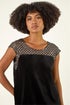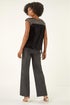 Velvet Sequin Mesh Top from Roman. Make a glamorous statement this Autumn Winter in this stunning velvet sequin top. Crafted from a plush velvet fabric with a delicate chiffon hem that finishes at the hips, making it both stylish and comfortable to wear. The top features a round neckline and elegant grown-on cap sleeves, while the sequin mesh yoke detail adds a touch of shimmer and sophistication. Pair with leather trousers and heels for a complete look that will turn heads at any special occasion!
