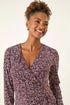 Leaf Print Chain Detail Midi Dress from Roman. Delicate and feminine, this stunning leaf print dress is perfect for Autumn Winter. The flattering v-neckline and long sleeves add a touch of elegance to your look. Gathered with a side chain creating a figure-enhancing fit that falls at knee length. Complete your outfit with tights and ankle boots for a stylish feel this fall!