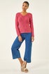 Scallop V-Neck Knit Jumper from Roman. Get ready to elevate your Spring Summer wardrobe with this charming scallop v-neckline jumper. Featuring a delightful texture detail, this jumper is perfect for adding a touch of elegance to your outfits. The long sleeves provide extra cosiness on those cooler days. Pair this feminine piece with your favourite jeans and trainers for a comfortable everyday look!