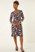 Floral Print Midi Stretch Dress from Roman. Get ready to bloom in style this Spring Summer with this floral print dress. Embrace the feminine v-neckline and delicate front button detailing paired with charming 3/4 length sleeves. Cut from a comfortable stretch fabric, this dress exudes elegance with its blooming floral print and knee length finish. Complete your perfect look by layering a denim jacket over and stepping into wedged heels!