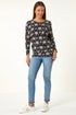 Abstract Print Round Neck Top from Roman. Get ready to make a statement with this eye-catching abstract print top. Featuring a flattering round neckline, this top showcases a unique abstract print design that adds a pop of personality to any outfit. The tie sleeves and folded band hem detail elevate the look, while the puff print adds a touch of texture. Pair with your favourite jeans and ankle boots for a chic and trendy Autumn/Winter ensemble.