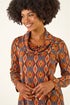 Abstract Print Cowl Neck Top from Roman. Make a statement this Autumn/Winter with this cowl neck print top. Crafted from a cosy snit jersey stretch fabric with an all over print, this top features elegant long sleeves. The cowl neckline adds a touch of sophistication, while the button detail on the shoulder is a chic finishing touch. Designed to finish at the low hip, this stylish top is perfect for pairing with jeans and ankle boots for a fashionable seasonal look.