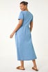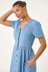Denim Button Through Midi Dress from Roman. This denim button-through midi dress is a timeless wardrobe staple. Designed with a flattering v-neckline and short sleeves, it features a fit-and-flare shape that enhances your silhouette. Perfect for any occasion, pair it with sandals for an effortlessly stylish look!