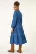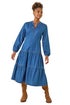 Cotton Denim Tiered Midi Dress from Roman. Upgrade your Autumn Winter wardrobe with this trendy cotton denim midi dress. The flattering v-neckline and long balloon sleeves add a touch of style to this classic piece, while the soft denim fabric ensures comfort all day long. Designed to a midi length with a tiered skirt for added movement, this dress is perfect for any occasion. Pair it with a denim jacket and ankle boots for a stunning fall look!
