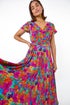Floral Ruched Waist Maxi Dress from Roman. Say hello to your new favourite Summer dress with this tie belt maxi length dress. The fit and flare silhouette features a thick ruched waistline to flatter your figure, while the v-neckline and short sleeves add a touch of elegance. Perfect for warmer days, the vibrant floral print and wooden button details at the bust make this dress a sweet addition to your daywear. Complete the look with sandals and a denim jacket for effortlessly chic Summer vibes!