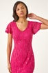Sequin Lace Ruffle Midi Dress from Roman. Add a touch of elegance to your Spring Summer wardrobe with this stunning sequin lace dress. Featuring a feminine V-neckline and delicate short sleeves with charming ruffle detail, this midi length dress is crafted from a stretch lace fabric adorned with subtle sequins. Pair it with sleek strapped heels and a trendy bolero for a polished and sophisticated look!
