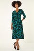 Abstract Print V-Neck Stretch Midi Dress from Roman. Wrap up in style with this chic midi dress in a fabulous abstract print. This dress features a feminine v-neckline and trendy wrap front, all crafted from a comfortable stretch jersey fabric for a flattering fit. It boasts fashionable 3/4 sleeves and falls at midi length, making it perfect for the Autumn Winter season. Complete your look with a denim jacket and ankle boots for a stunning fall outfit!