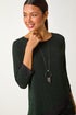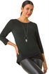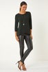 Necklace Trim Shimmer Top from Roman. Get ready to dazzle in our brillo tunic stretch top this Autumn Winter season. The flattering round neckline and cosy 3/4 length sleeves keep you warm and stylish, finishing in a tunic shape that's perfect for any party. Crafted from a stretchy jersey fabric, this top features a striking contrast banded hem for added flair. Pair with faux leather pants and ankle boots for a trendy fall look!