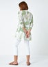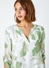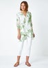 Palm Print V-Neck Wrap Hem Tunic Top from Roman. Pretty palm prints are key for the warmer months and this light weight, wrap hem shirt showcases them beautifully. Cut from a printed, woven fabric this piece features a feminine v neckline and fun 3/4 length sleeves. Designed in an oversized, longline tunic style this is both comfortable and stylish. Add cropped jeggings and sandals for a fuss free but fashionable look!