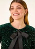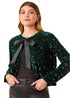Sequin Bow Front Jacket from Roman. Shine bright like a diamond in this stunning sequin jacket, just in time for the Autumn/Winter season. Adorned with a chic bow tie detail at the neck, this jacket features elegant long sleeves for a sophisticated touch. Perfect for adding a touch of glamour to any outfit, style this sequin jacket with a sleek cami top, your favourite jeans, and a pair of statement heels for a show-stopping look!