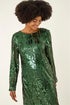 Sequin Shift Stretch Dress from Roman. Unleash your inner sparkle with this shimmer shift dress! Perfect for the upcoming party season, this knee-length beauty is crafted from a stretch jersey fabric adorned with dazzling sequin embellishments, sure to make you the star of the event. With a classic round neckline and long sleeves, this dress is timeless yet glamorous. Complete the look with strappy heels and a trendy bolero!