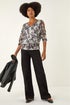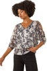 Metallic Plisse Banded Hem Top from Roman. Elevate your Autumn/Winter style with this chic plisse top. Boasting a flattering V-neck and trendy 3/4 length cold shoulder sleeves, this top sparkles with metallic plisse detail throughout. The banded hem adds a touch of sophistication, while the body lining ensures a comfortable fit. Finished with framilion on the hem band for an extra special touch. Pair with jeans and ankle boots for a stylish ensemble that is perfect for day or night!