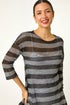 Metallic Stripe Knit Top from Roman. Shine bright this Autumn/Winter season in our stylish metallic stripe knit. The round neck and 3/4 sleeves make this the perfect cosy yet chic choice. Crafted from a soft knitted fabric with silver metallic thread running through for a touch of sparkle. Cut to a flattering below hip length, this stripe knit is perfect for adding a touch of glamour to your everyday outfits. Pair with jeggings and ankle boots for a trendy look!