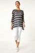 Learn moreMetallic Stripe Knit Top from Roman. Shine bright this Autumn/Winter season in our stylish metallic stripe knit. The round neck and 3/4 sleeves make this the perfect cosy yet chic choice. Crafted from a soft knitted fabric with silver metallic thread running through for a touch of sparkle. Cut to a flattering below hip length, this stripe knit is perfect for adding a touch of glamour to your everyday outfits. Pair with jeggings and ankle boots for a trendy look!
