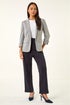 Petite Pocket Ponte Blazer from Roman. Add a touch of sophistication to your Spring Summer wardrobe with this trendy Petite ponte jacket. Designed with a classic collar and revere style, this jacket features non-functional button and tab detail on the cuff and long sleeves. The pull-on style and full opening make it easy to wear, while the welt pockets on the hips add a functional element. Layer this versatile jacket over your favourite blouse and trousers for a polished and elegant look!