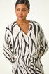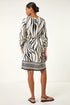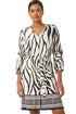 Abstract Border Tie Shirt Dress from Roman. Unleash your inner boho vibe with this abstract border tie dress, perfect for the warmer months. Featuring a stylish v-neck and flattering 3/4 sleeves, this shirt dress falls at knee-length and comes with a self-tie belt to cinch in the waist. The eye-catching abstract border print adds a touch of whimsical charm to this must-have piece. Pair with sandals and throw on a denim jacket for a trendy daytime look!
