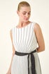 Border Print Pleated Midi Dress from Roman. Get ready for your next occaison in style with our pleated print dress. Featuring a stunning border print with intricate pleating, this midi dress is perfect for any Spring Summer event. The round neckline adds a classic touch, while the contrast tie fabric belt cinches in the waist for a flattering fit. Style with strappy heels and a trendy bolero for a polished look!