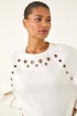 Eyelet Detail Stretch Top from Roman. Add a touch of chic to your wardrobe with this stylish long sleeve top. The round neckline adorned with eyelet details adds a fashionable twist to this classic piece. Cut from a stretch jersey fabric, this top offers both comfort and style. Perfect for the season, pair this top with a denim jacket and jeggings for a complete on-trend look!