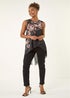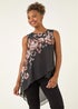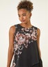 Floral Wrap Sequin Top from Roman. Elevate your Autumn/Winter wardrobe with this stunning floral wrap top. Adorned with a beautiful floral placement print, this sleeveless top features a classic round neck and flattering wrap style. The high-low hem design adds a modern touch to this feminine piece. Perfect for pairing with jeans and ankle boots for a chic and stylish look that transitions seamlessly from day to night!