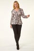 Petite Abstract Twist Front Top from Roman. Make a stylish statement this Autumn/Winter with this twist front top! The flattering V-neck and long set-in sleeves give a classic look, while the twist detail at the front adds a modern touch. Cut from a comfortable printed woven fabric, this top is easy to pull on and finishes at the hips for a versatile style. Pair with jeggings and ankle boots for a chic and effortless outfit!